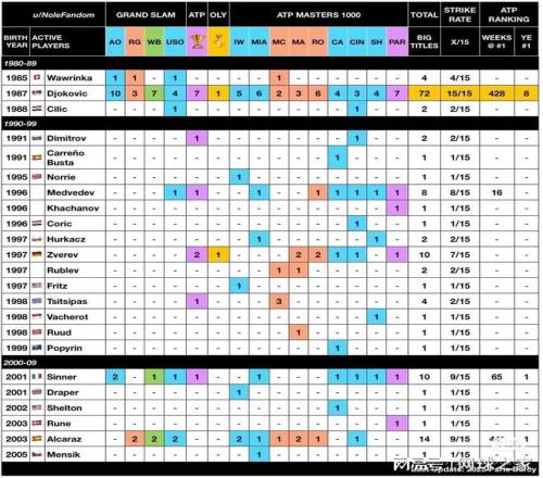 本赛季的大师赛已经结束,除了德雷珀、门希克、鲁德、瓦舍罗和谢尔顿成为新大师外,其余四个冠军均被阿尔卡拉斯和辛纳瓜分。