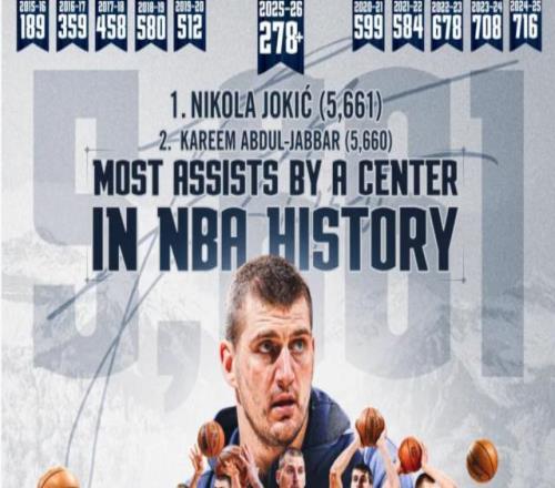 加冕时刻!约基奇助攻数超张伯伦登顶中锋历史第1